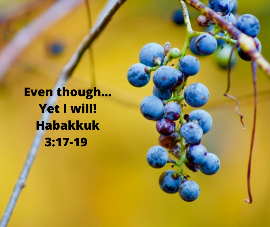 Even though the fig trees have no blossoms, and there are no grapes on the vines; even though the olive crop fails, and the fields lie empty and barren; even though the flocks die in the fields, and the cattle barns are empty, Yet I will rejoice in the Lord! I will be joyful in the God of my salvation! The Sovereign Lord is my strength! He makes me as surefooted as a deer. Habakkuk 3:17-19 NLT